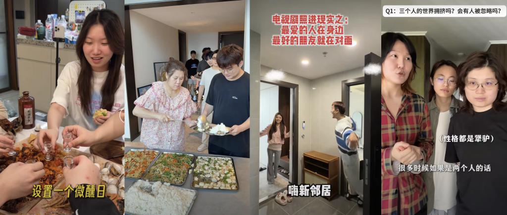 随着群居题材升温,各路网红都开始向其靠拢。普遍做法是和朋友租住在一个小区,隔三差五去对方那里串门。“自嗨姐妹”的依然在结婚后,仍带着男闺蜜杨俊豪一同生活,惹得粉丝直呼感动。河马君、万宁叔夫妇、九呵呵等博主的“团建”现场,也总能卷起流量洪流。